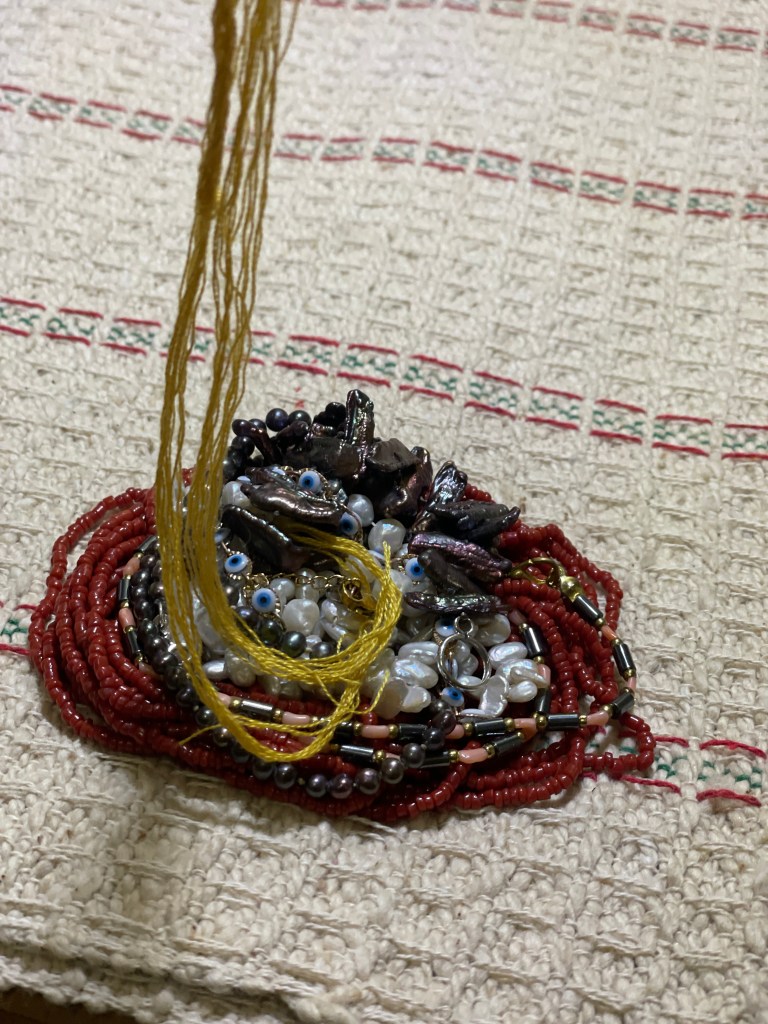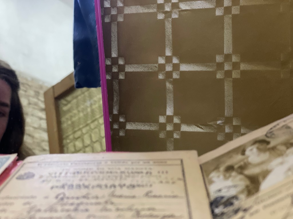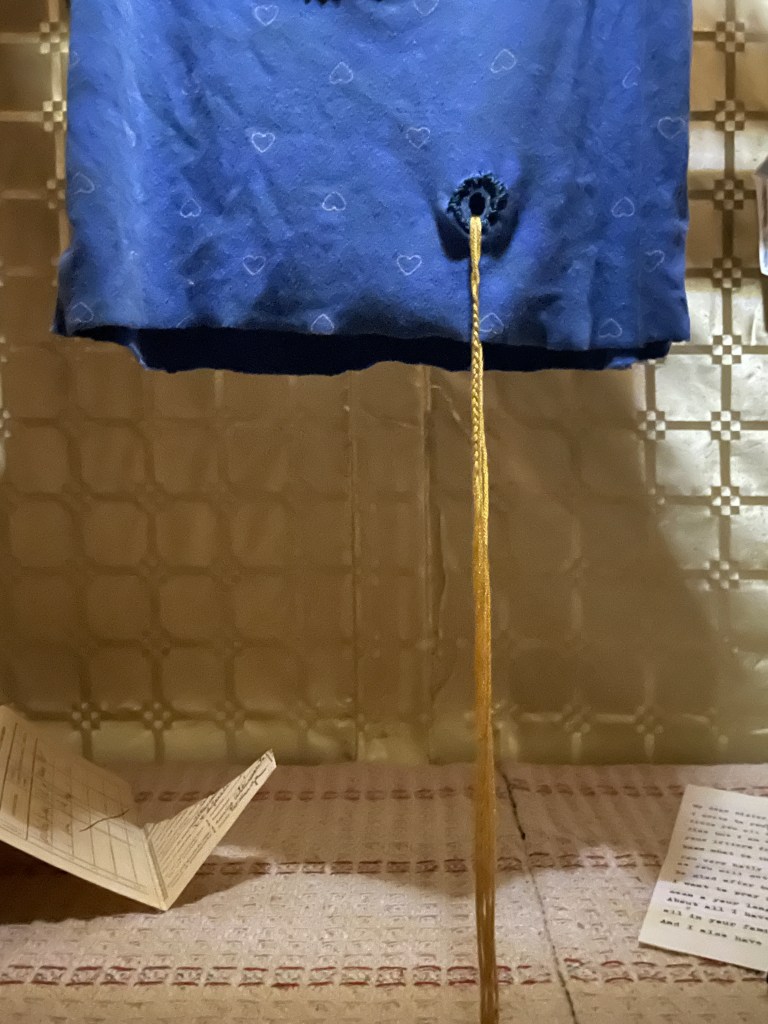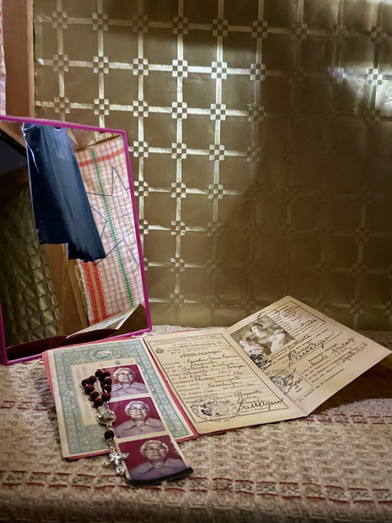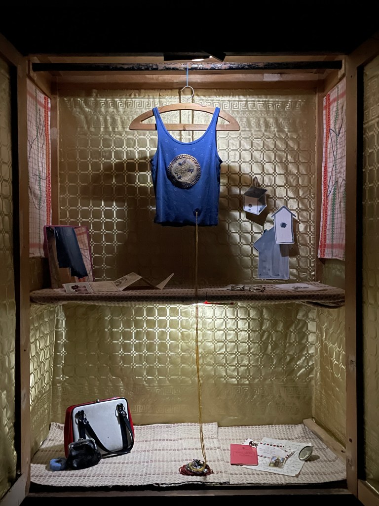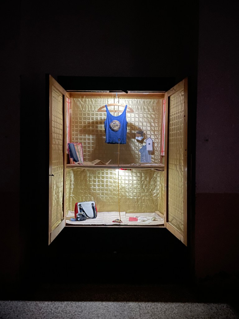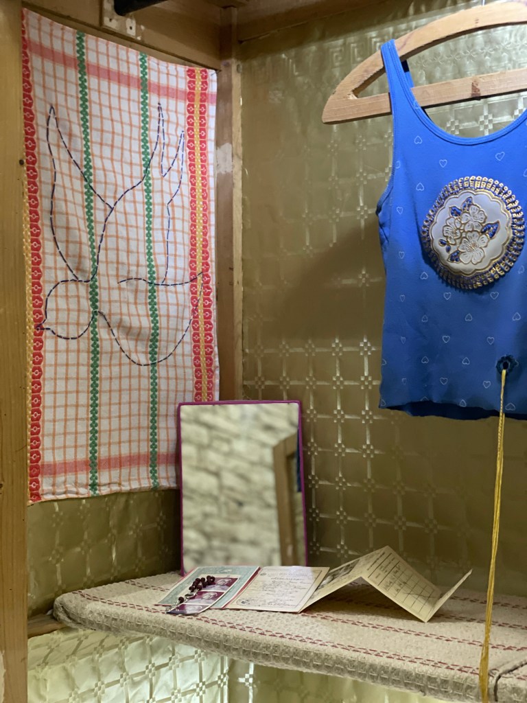 Family heirlooms, personal objects, scented rosary, embroidery on kitchen towels, gouache on paper, wardrobe cabinet found on-site