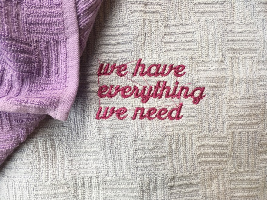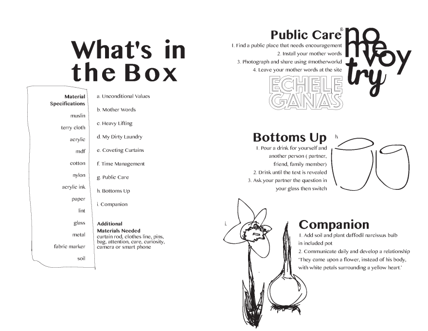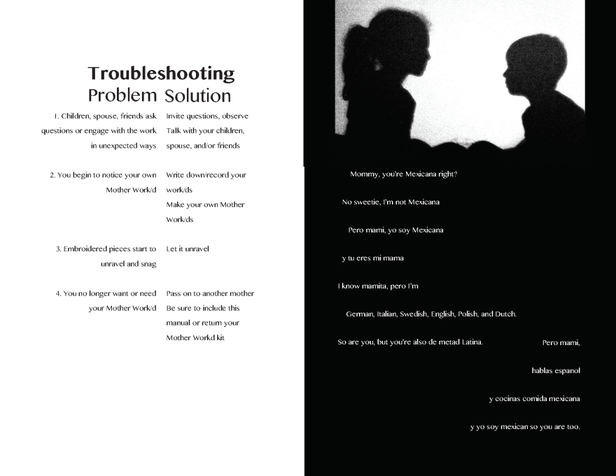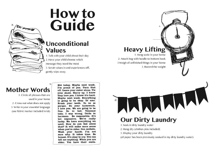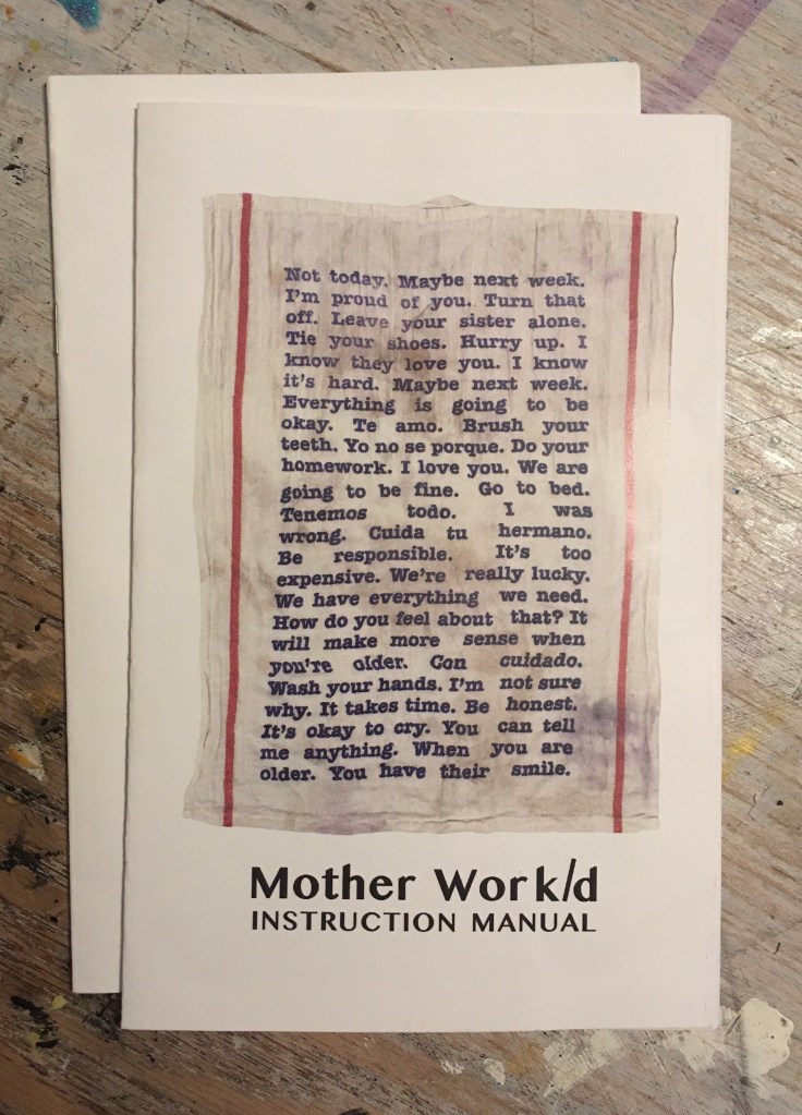 MotherWork/d is a gesture of gratitude and a vehicle for questioning traditional gender roles, maternal identities, and domestic obligations in the form of a gift. This gift is composed of domestic objects, infused with mother words and sentiments depicting mi experiencia de ser madre. Mother Work/d also exemplifies my values and parenting methods, pero le premite the recipient to use, edit, and supplement the objects as they see fit. The work continues to evolve beyond the original content; recipients have the opportunity to create as well as activate the items. Todos los objetos are to be used en la vida diario; to be worn out, stained, and torn to accumulate each mother’s story. 2018-ongoing.