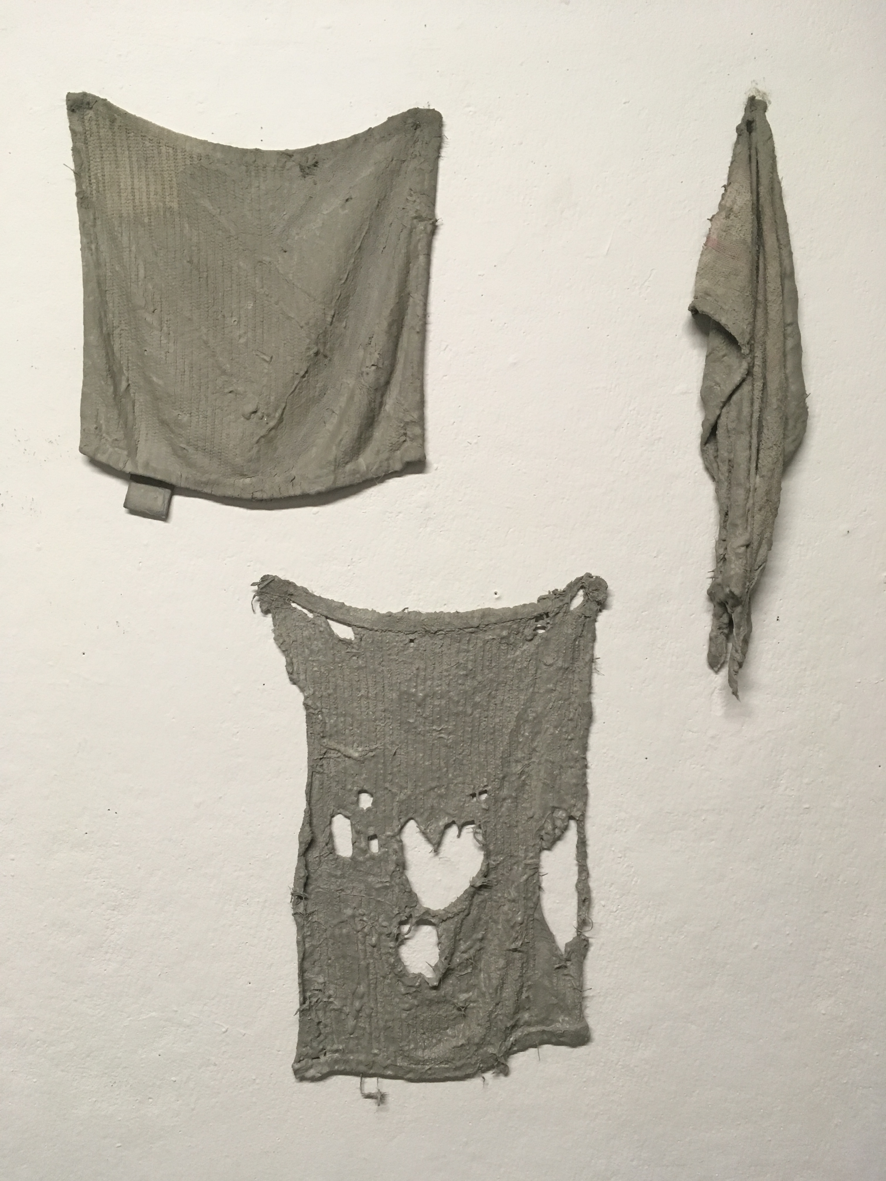 Each individual “trophy” represents my relationship to the domestic mundane; the weight carried when bound to traditional gender roles; and the dreams put on hold in the name of caring for one’s family. As a Mother Artist, I am learning to push back against the interruptions domestic work causes and am prioritizing my art practice above my domestic duties. This is both an act of rebellion and evidence of triumph. These cemented dish towels and washcloths, the most functional of domestic items, have been rendered completely non-functional. Putting them to work again would be an impossible and even absurd task.